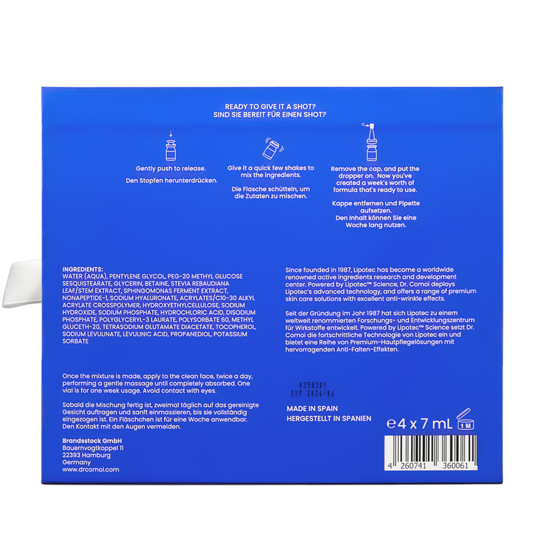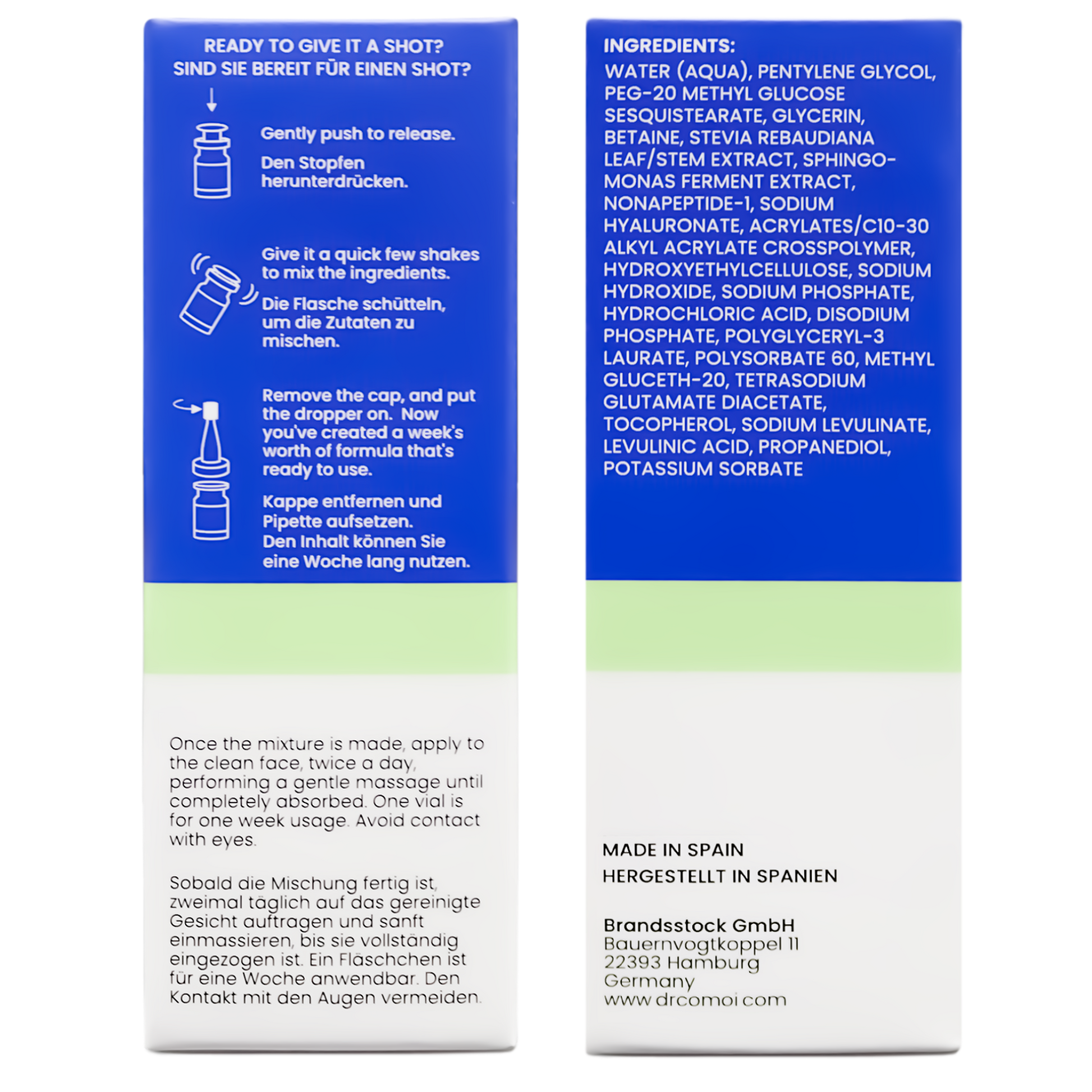 Aktivieren Sie das 2-Phasen-Frische-Serum, indem Sie die Schutzfolie entlang der Perforation entfernen und den Knopf oberhalb des Deckels drücken. Nach einem hörbaren Klicken kräftig durchschütteln, um die Inhaltsstoffe zu vermischen. Mit der Applikatorspitze vier bis fünf Tropfen zügig auf das vorab gereinigte Gesicht auftragen, idealerweise morgens und abends, analog zur DR. COMOI Skin Treat-Anleitung mittels Effleuragetechnik. Nach erstmaligem Gebrauch vor direkter Lichteinwirkung schützen und kühl (auch zur Kühlschrankaufbewahrung geeignet) und trocken lagern.