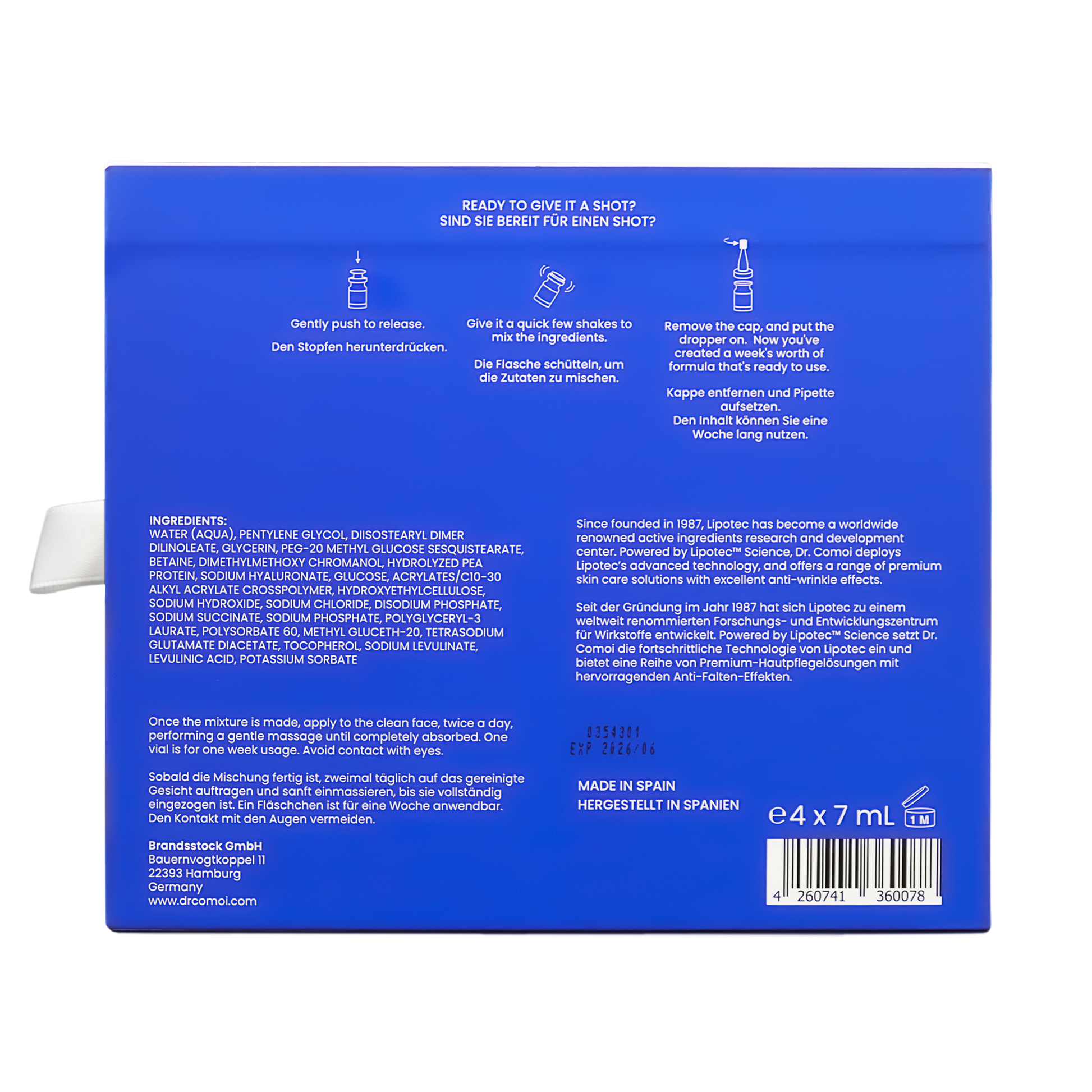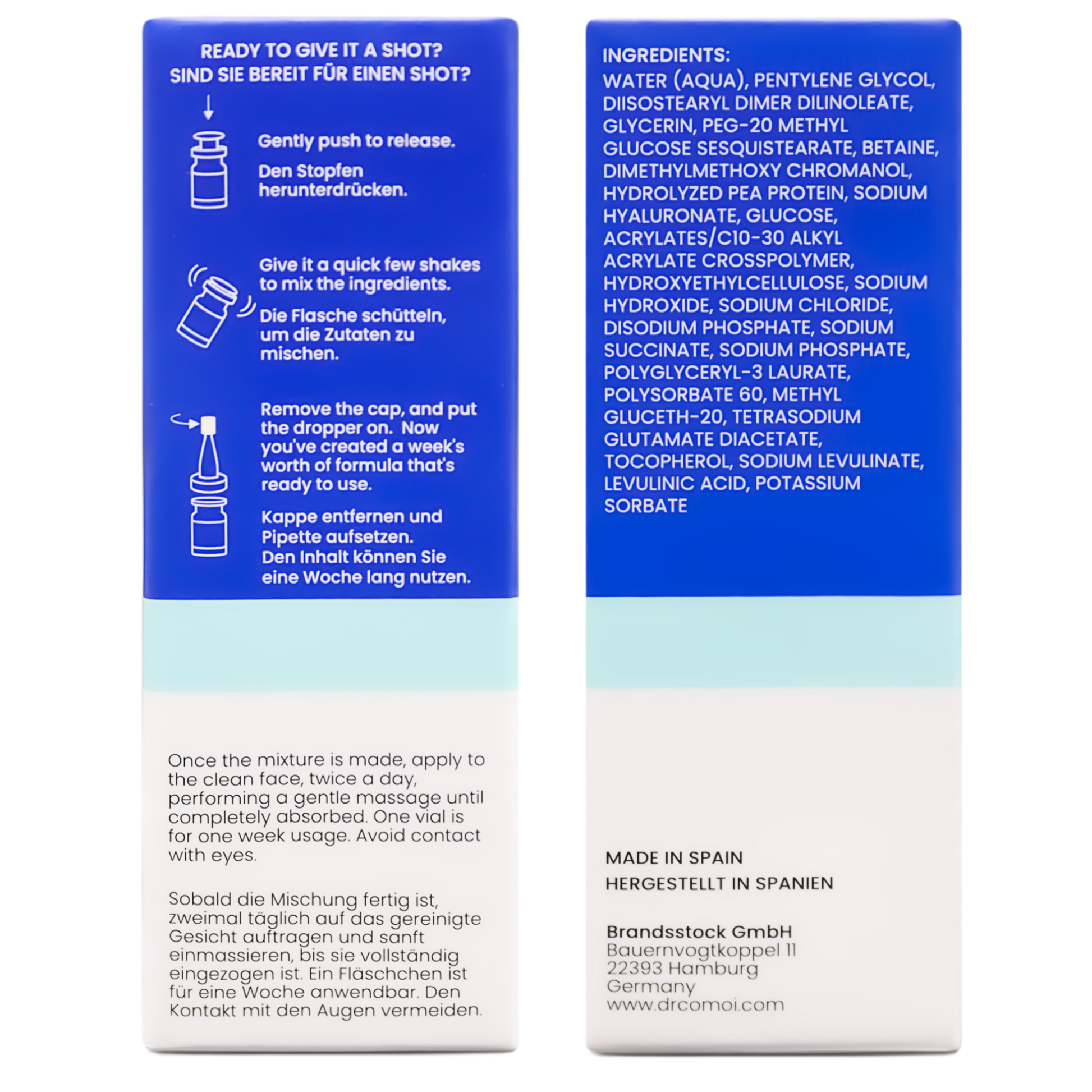 Aktivieren Sie das 2-Phasen-Frische-Serum, indem Sie die Schutzfolie entlang der Perforation entfernen und den Knopf oberhalb des Deckels drücken. Nach einem hörbaren Klicken kräftig durchschütteln, um die Inhaltsstoffe zu vermischen. Mit der Applikatorspitze vier bis fünf Tropfen zügig auf das vorab gereinigte Gesicht auftragen, idealerweise morgens und abends, analog zur DR. COMOI Skin Treat-Anleitung mittels Effleuragetechnik. Nach erstmaligem Gebrauch vor direkter Lichteinwirkung schützen und kühl (auch zur Kühlschrankaufbewahrung geeignet) und trocken lagern.