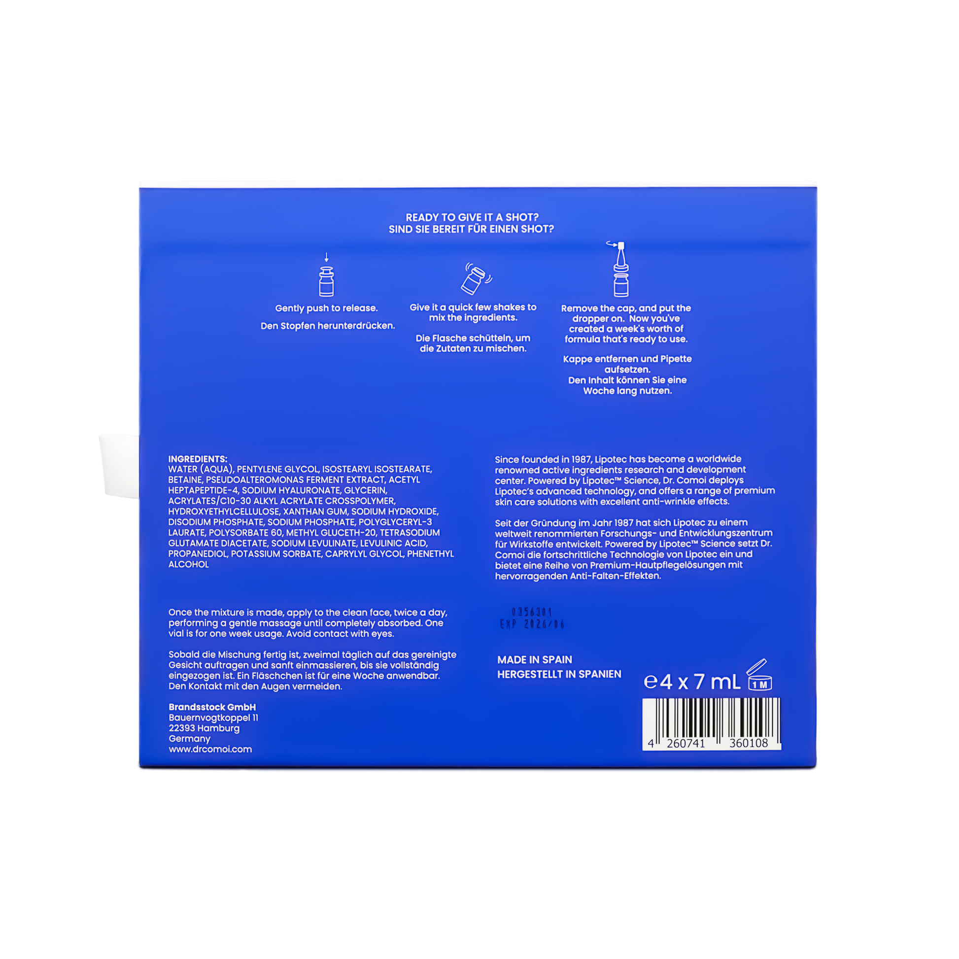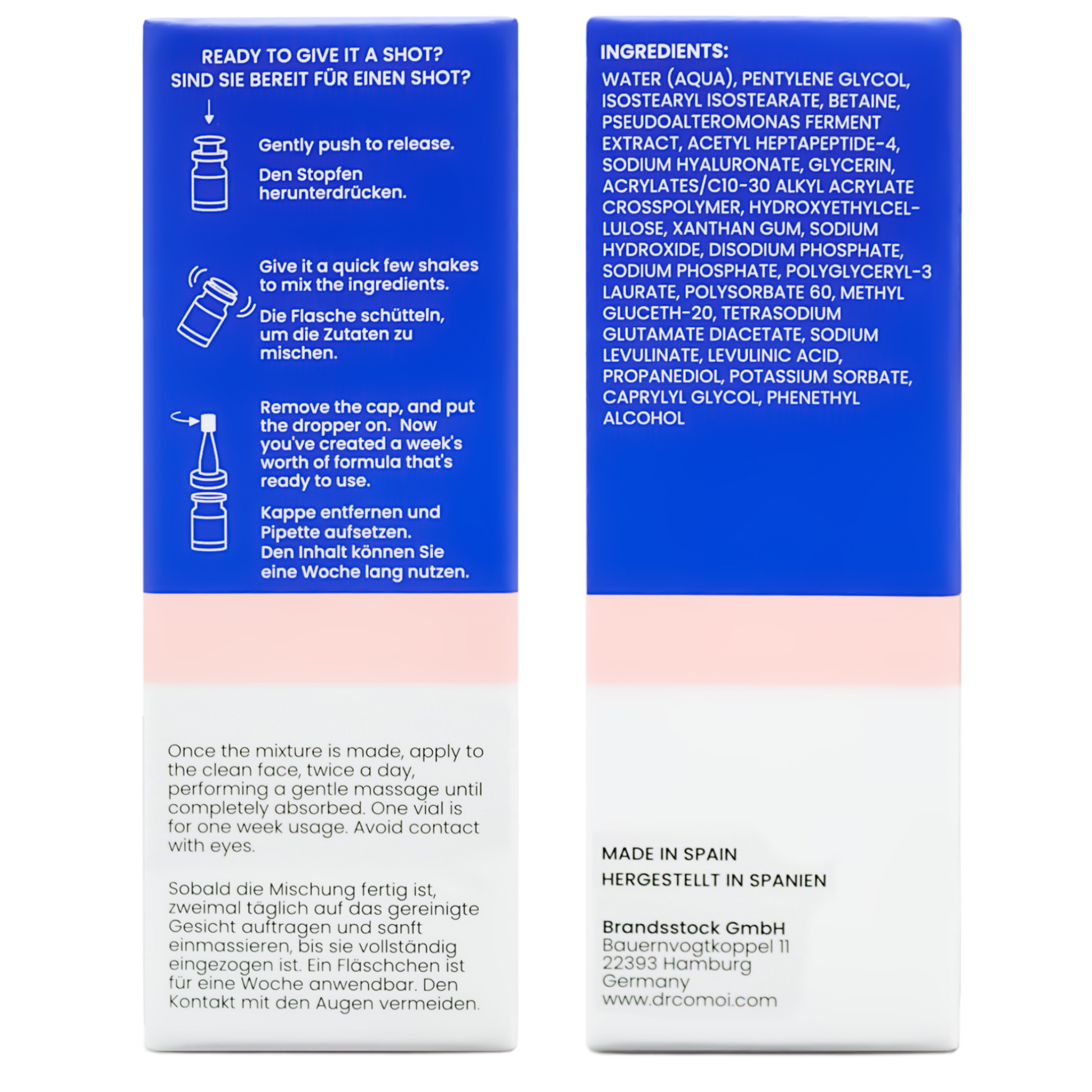 Aktivieren Sie das 2-Phasen-Frische-Serum, indem Sie die Schutzfolie entlang der Perforation entfernen und den Knopf oberhalb des Deckels drücken. Nach einem hörbaren Klicken kräftig durchschütteln, um die Inhaltsstoffe zu vermischen. Mit der Applikatorspitze vier bis fünf Tropfen zügig auf das vorab gereinigte Gesicht auftragen, idealerweise morgens und abends, analog zur DR. COMOI Skin Treat-Anleitung mittels Effleuragetechnik. Nach erstmaligem Gebrauch vor direkter Lichteinwirkung schützen und kühl (auch zur Kühlschrankaufbewahrung geeignet) und trocken lagern.
